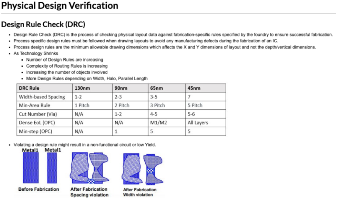 - It is part of a broader physical verification suite, including Layout vs. Schematic (LVS), Electrical Rule Checking (ERC), and Antenna checks.