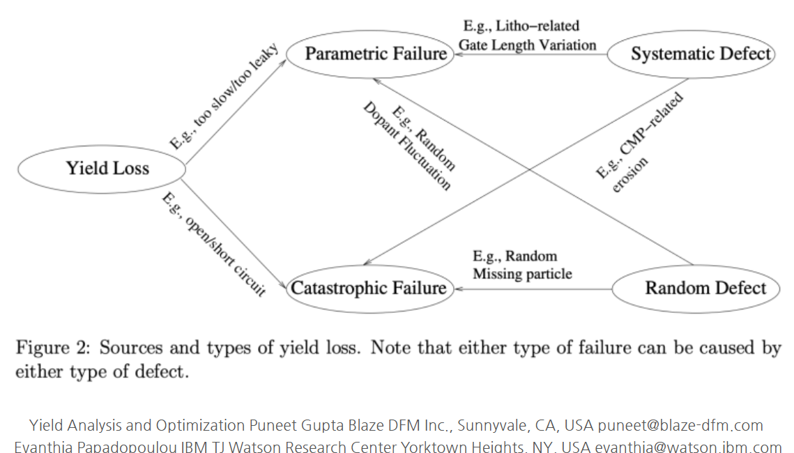 - Systematic Defects: Result from design or process issues affecting multiple chips, such as mask misalignment or incorrect etching patterns.