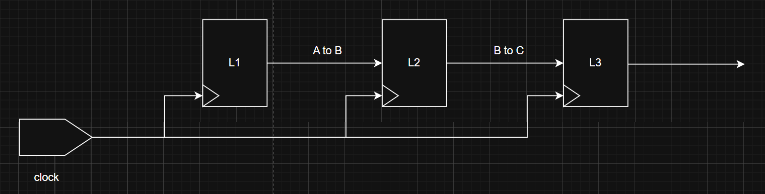 Consider a circuit with three sequential cells (L1, L2, L3) connected in series, controlled by the same clock.
