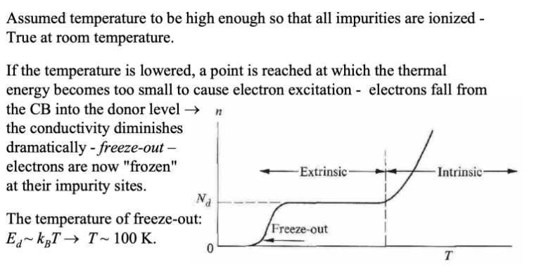 Freeze-Out: At low temperatures, even doped semiconductors experience insufficient ionization of donors or acceptors, causing most free carriers to disappear.
