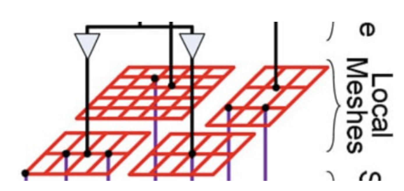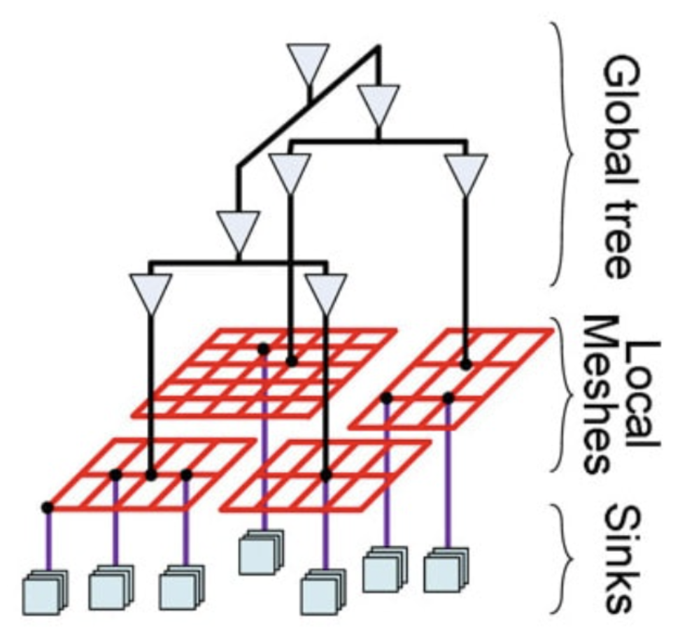 - At the upper level, multiple clock drivers (buffers) simultaneously drive the mesh grid.