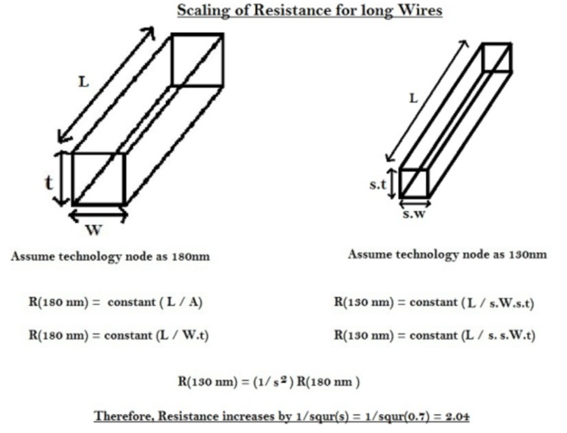 For a short wire, all three factors (length, width, thickness) scale down by the same factor, 0.7. Consequently, according to the equation below, the resistance of the short wire increases by a factor of 1.42 due to scaling.