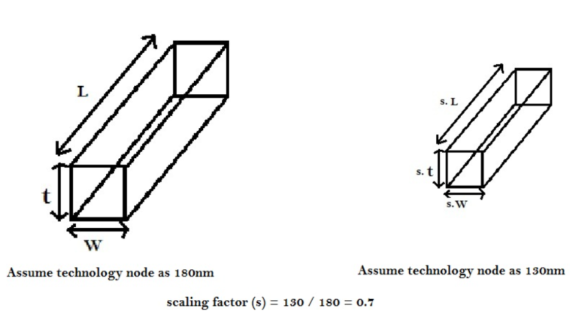 Let's assume the semiconductor process scales from 180nm to 130nm. The gate length scaling factor is approximately 0.7 (i.e., 130nm / 180nm). Therefore, s ≈ 0.7. Let's consider a short wire.
